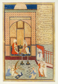 Ikkinchi xikoya . "Bahrom oltin qasrda". Shox sariq libos kiygan rumlik go`zal bilan may ichish arafasida. Quyida musiqachilar ansambli. Bu o`rinda sariq rang bilan bog`liq "lya" pardasi ustuvor bo`lib, u Iroq maqomiga dastlabki tayanch asos sifatida xizmat qiladi. "Lya" tovushi xozirgi kunda ham Iroq nomi bilan ma'lum maqomlarning tayanch pardasi xisoblanadi. |