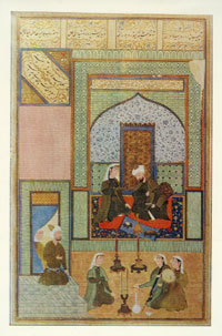 Shu bilan birga "Sab'ai sayyor"dagi etti xikoyaga ishlangan miniatyuralar asosida etti maqom har birining pardalarini aniqlab olish imkoninini mavjud ko`rinadi. Shundayki, adabiy manbaga ko`ra etti xikoyaning har biri muayyan rang bilan muqim bog`langan xolda bayon etiladi. Nizomiy Ganjaviyning "Xaft paykar" va Xisrav Dehlaviyning "Hash bihisht" dostonlariga ishlangan miniatyuralar hikoyalarda ko`zda tutilgan ana shu rang talablariga deyarli mos keladi. Biroq Alisher Navoiyning "Sab'ai sayyor" dostoniga ishlangan miniatyuralarda o`zgacha vaziyatni ko`ramiz. Masalan, birinchi xikoya qora qasrda, unda hozir bo`lgan Bahrom va hind go`zali qora liboslarda, qadahdagi maylar ham, xullas barcha borliq qora rangda bo`lishi kerak edi. Biroq buning o`rniga "Bahrom qora qasrda" mo`'jaz tasvirida etti xil rangning o`zaro go`zal uyg`unlik kashf etganini ko`ramiz. Bu hol ayniqsa musiqachilar tasvirida yaqqol namoyon bo`ladi va turli o`zgarishlar bilan keyingi xikoyalarga ishlangan tasvirlarda ham zuhur etadi. Faraz qilishimizcha, adabiy manbadan bu alfozda "chekinishdan" maqsad xikoyalar zamirida mavjud botiniy musiqani, aniqroq aytganda, maqom pardalari va navolarini ranglar vositasida imkon qadar ifoda ettirish istagidan kelib chiqqan. Bu kabi murakkab ijodiy vazifani musavvirlar bevosita hazrat Navoiy ko`rsatmasi asosida amalga oshirgan bo`lsalar ham ajab emas. Shu asnoda miniatyura tasvirlarida ramziy mavjud maqom pardalarini aniqlashga urinib ko`ramiz. |